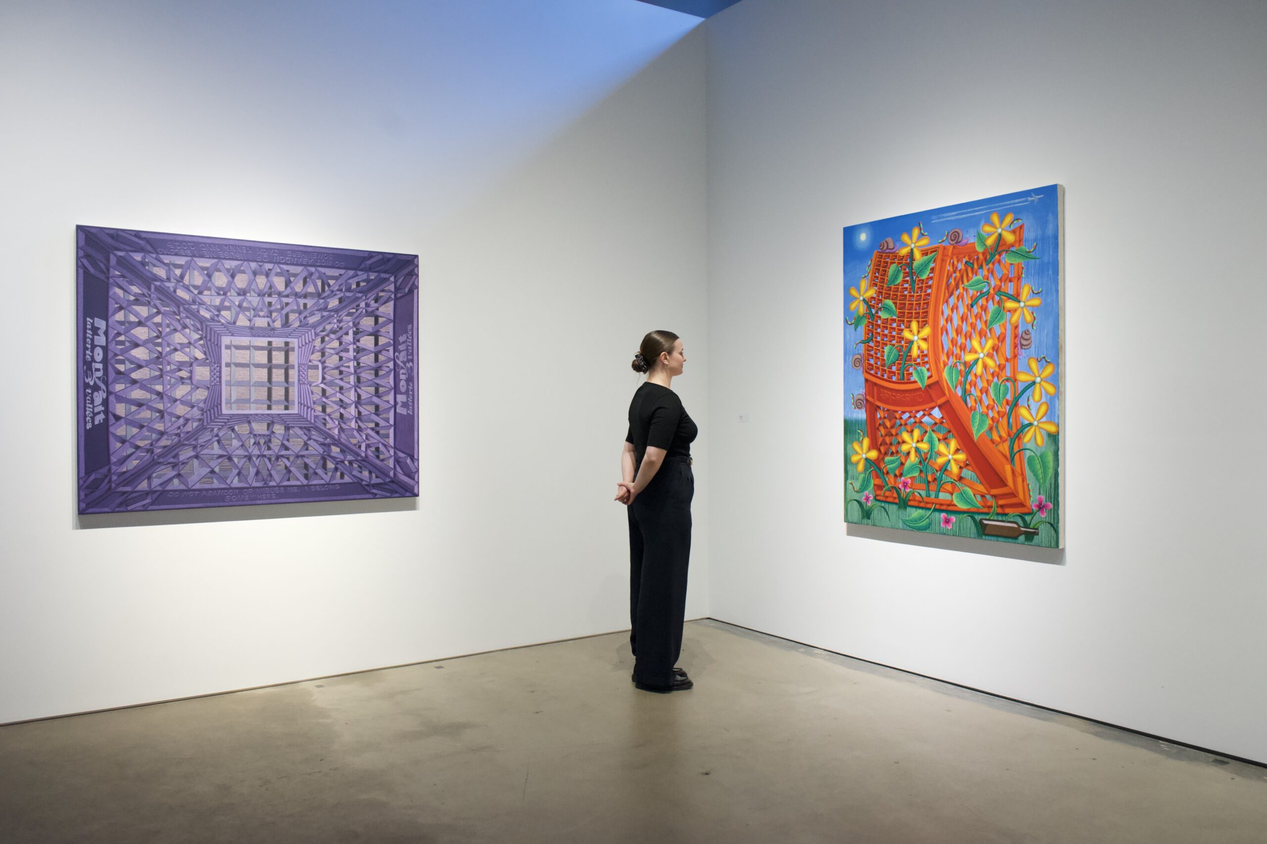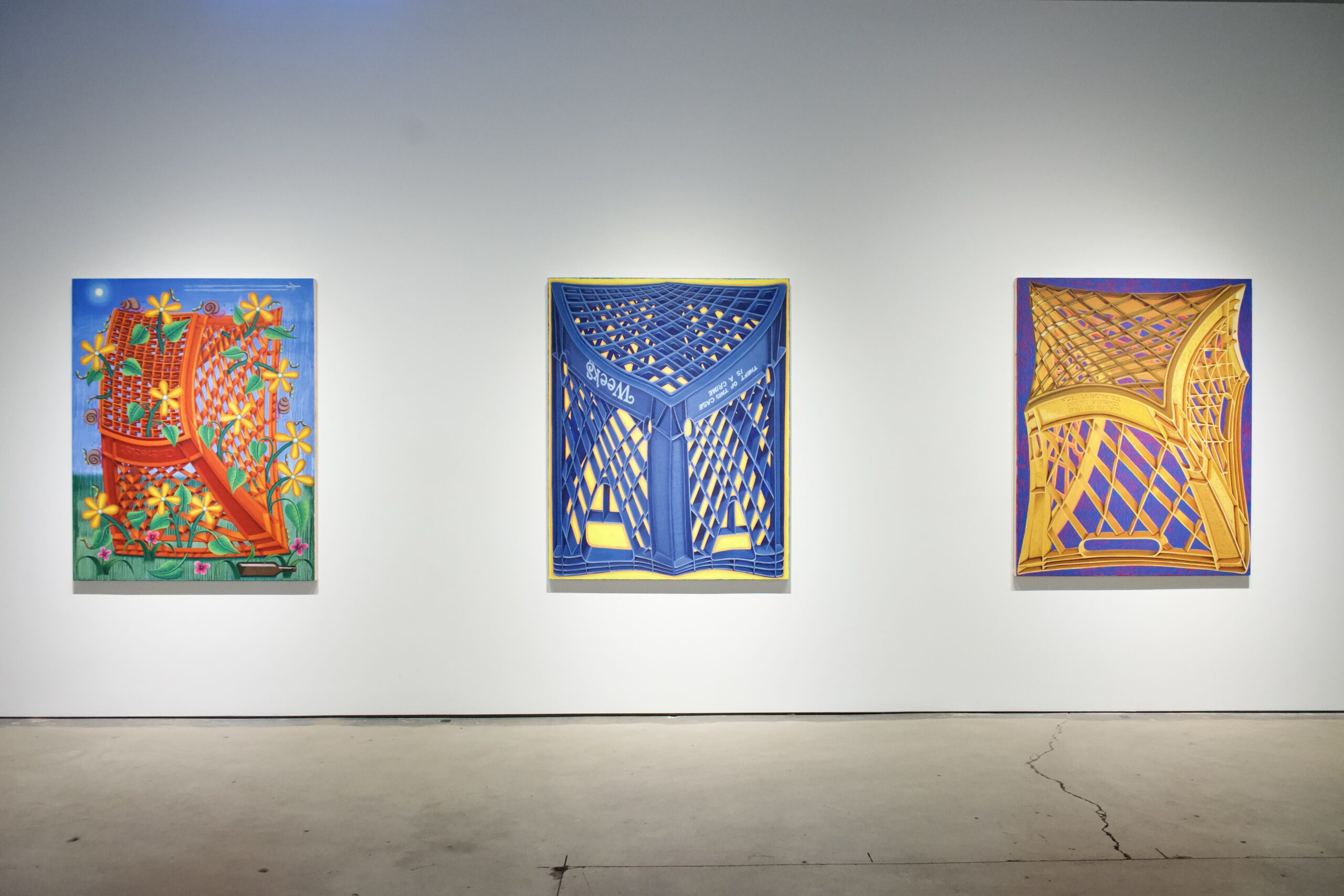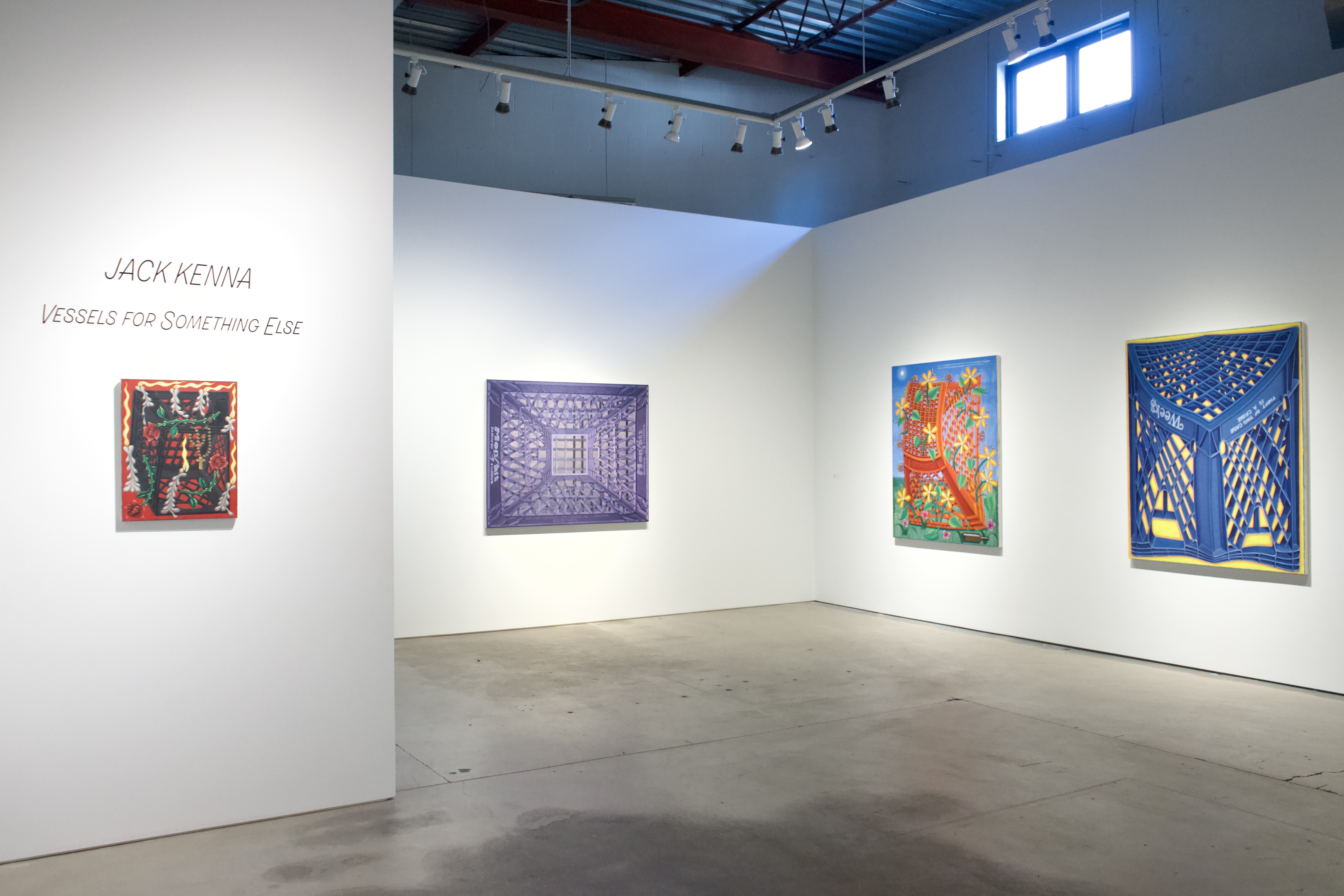 In Vessels for something else, milk crates serve as an underlying scaffold— sometimes the centrepiece, sometimes a silent support—organizing each painting and receding into the background while shaping the composition. As Jack Kenna describes, “they fulfill their intended use as vessels for something else, be it an arrangement of objects, a vulnerable message, or as a compositional framework for the painting itself.” Kenna’s work invites viewers to reconsider simple utilitarian objects as sites of vulnerability and creative possibility.